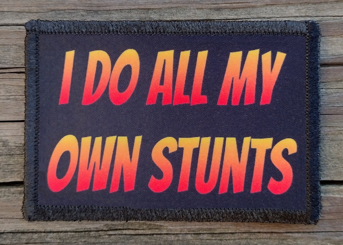 I Do All My Own Stunts Velcro Morale Patch. Size: 2x3". Hook and Loop (Velcro) backing for Tactical Gear, Backpacks, Rucksacks, Molle Equipment, Operator Hats, Headliners and so much more! Our custom morale patches are handmade to order in North Carolina. Unlike an embroidered patch, our patches are made with permanant ink infusion, so they are washable and will never fade or fray. Free USPS Shipping On All Orders!