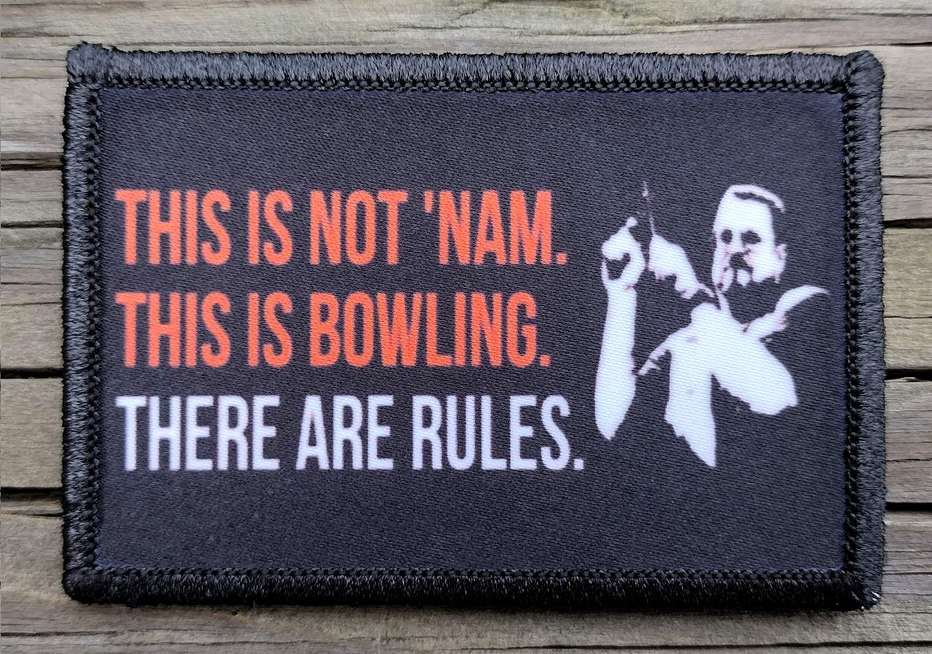 The Big Lebowski This Is Not Nam This Is Bowling Velcro Morale Patch. Size: 2x3". Hook and Loop (Velcro) backing for Tactical Gear, Backpacks, Rucksacks, Molle Equipment, Operator Hats, Headliners and so much more! Our custom morale patches are handmade to order in North Carolina. Unlike an embroidered patch, our patches are made with permanant ink infusion, so they are washable and will never fade or fray. Free USPS Shipping On All Orders!