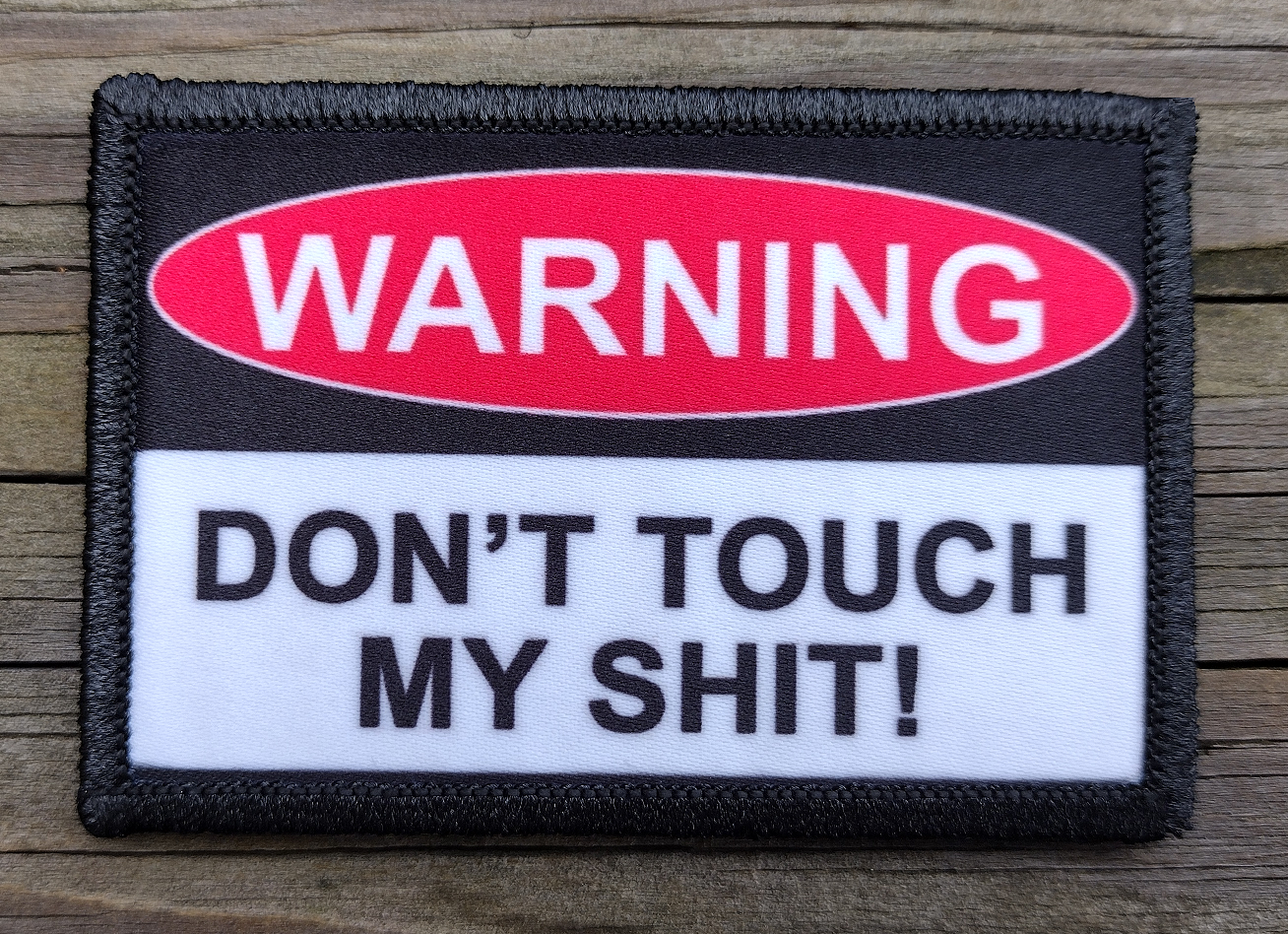 Warning Don't Touch My Shit Velcro Morale Patch. Size: 2x3". Hook and Loop (Velcro) backing for Tactical Gear, Backpacks, Rucksacks, Molle Equipment, Operator Hats, Headliners and so much more! Our custom morale patches are handmade to order in North Carolina. Unlike an embroidered patch, our patches are made with permanant ink infusion, so they are washable and will never fade or fray. Free USPS Shipping On All Orders!